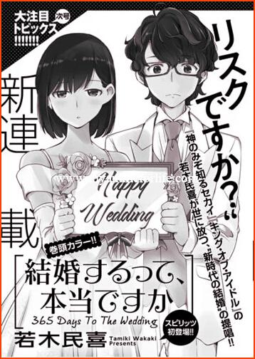 On Monday it was declared by this year’s 15th issue of Shogakukan’s Weekly Big Comic Spirits magazine that in the 16th issue of the magazine a new manga named Kekkon Surutte, Hontō desu ka?: 365 Days To The Wedding is going to be commence by Tamiki Wakaki, on March 16 the issue will be dispatch.